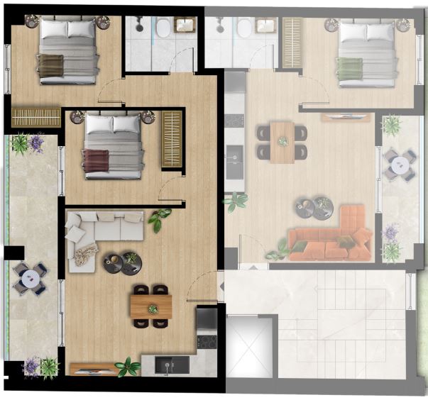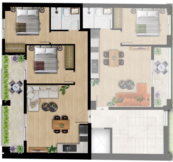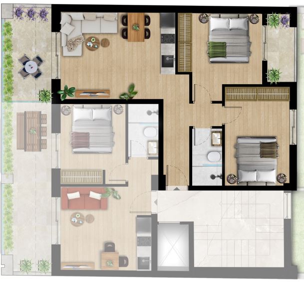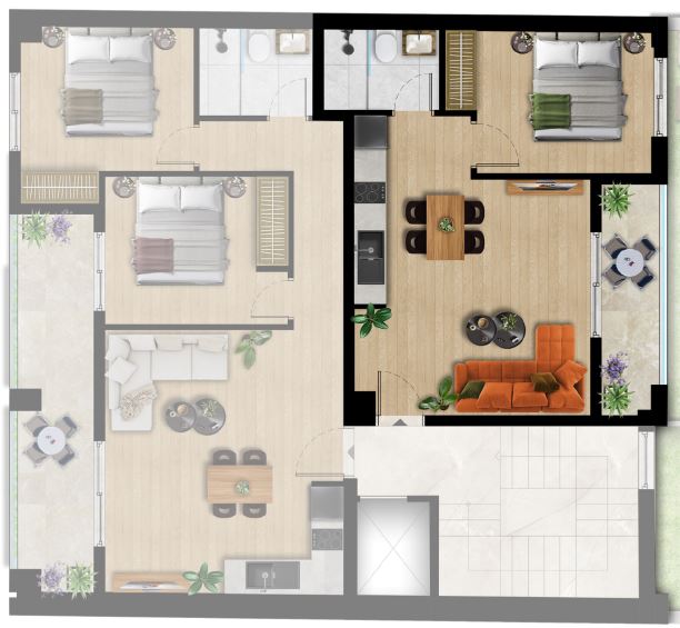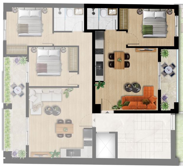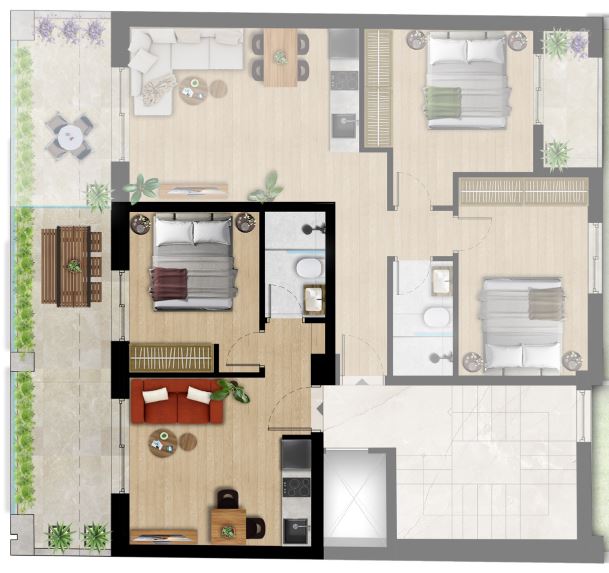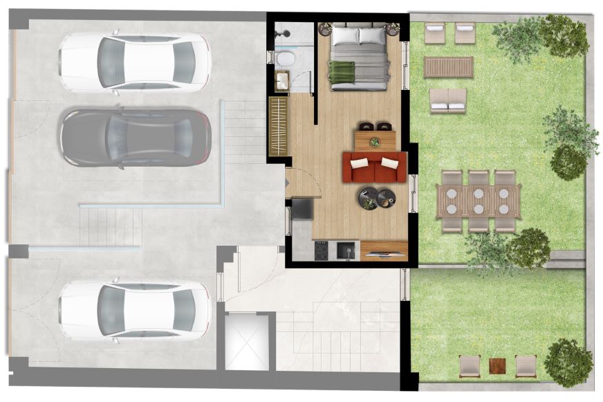 Το κτίριο περιλαμβάνει 3 αποκλειστικές θέσεις στάθμευσης (για συγκεκριμένα διαμερίσματα), μια σπάνια πολυτέλεια στην περιοχή και κάθε διαμέρισμα διαθέτει πλήρες πακέτο επίπλων και ηλεκτρικές συσκευές, όπως φούρνους, εστίες, ψυγεία και μονάδες κλιματισμού.