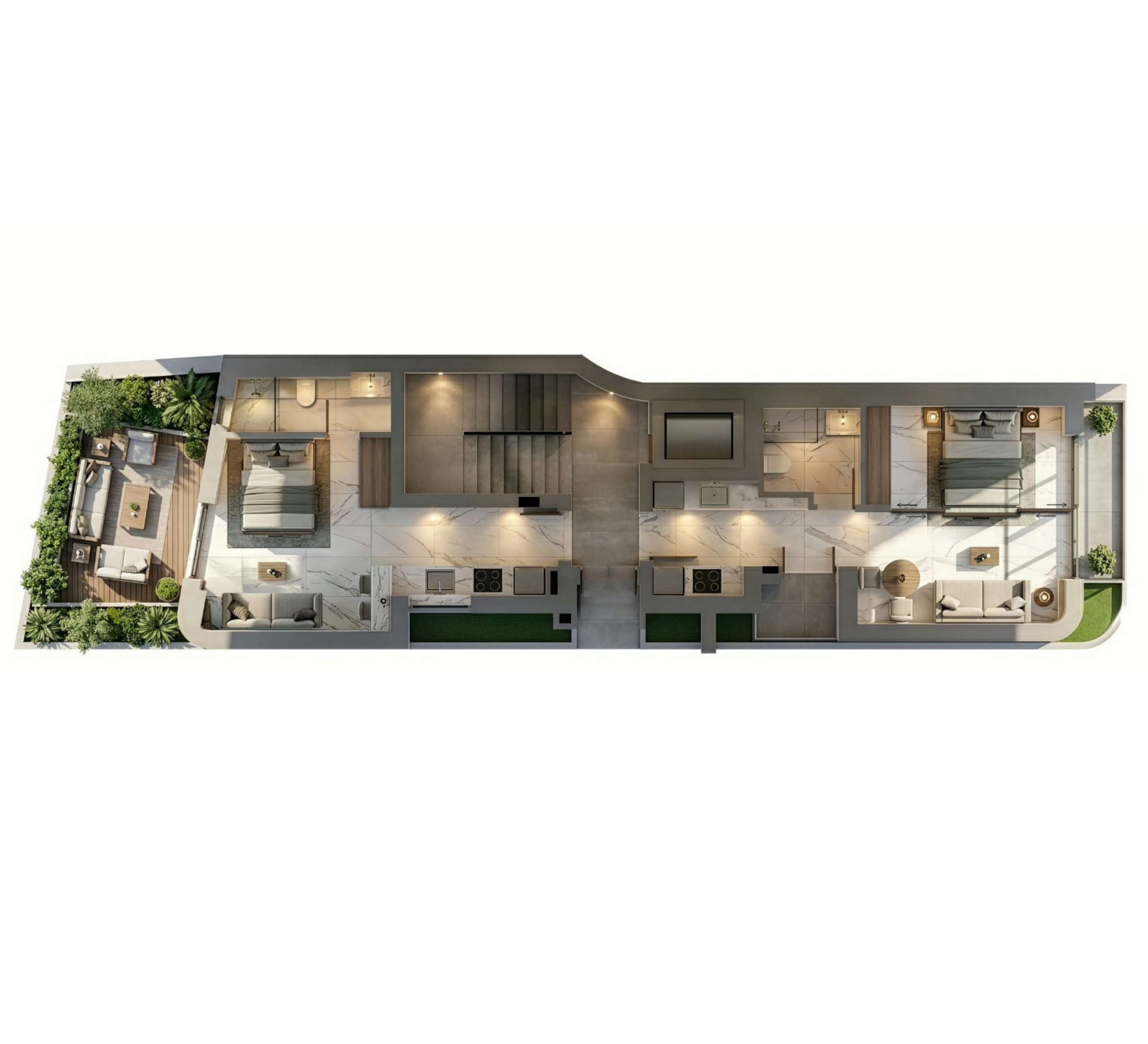 Η προσέγγισή μας συνδυάζει καθαρές γεωμετρικές γραμμές, άπλετο φυσικό φως και διαχρονικά υλικά. Το αποτέλεσμα είναι ένα κτίριο που μοιάζει σμιλευμένο και όχι απλώς κατασκευασμένο, μινιμαλιστικό αλλά ζεστό, σύγχρονο αλλά βαθιά ριζωμένο στη διακριτική αθηναϊκή κομψότητα. Στο εσωτερικό, οι προσεκτικά σχεδιασμένοι χώροι δημιουργούν μια αβίαστη ροή ανάμεσα στην ιδιωτικότητα και την κοινωνική εξωστρέφεια. Τα μεγάλα ανοίγματα φέρνουν την πόλη μέσα, χωρίς να διαταράσσουν την αίσθηση γαλήνης, ενώ οι αισθητικές επιλογές αποπνέουν εκλεπτυσμένο γούστο, συνειδητή διαβίωση και αρχιτεκτονική καθαρότητα.